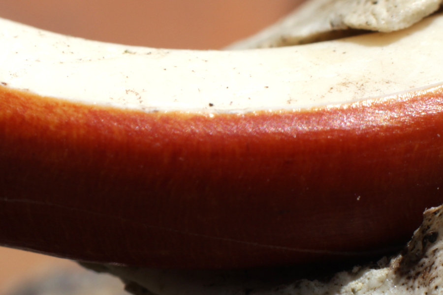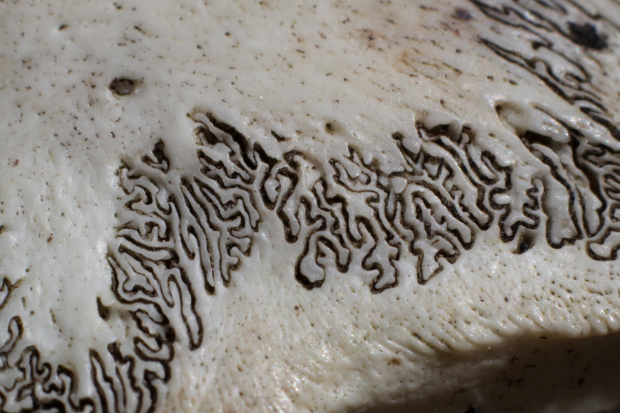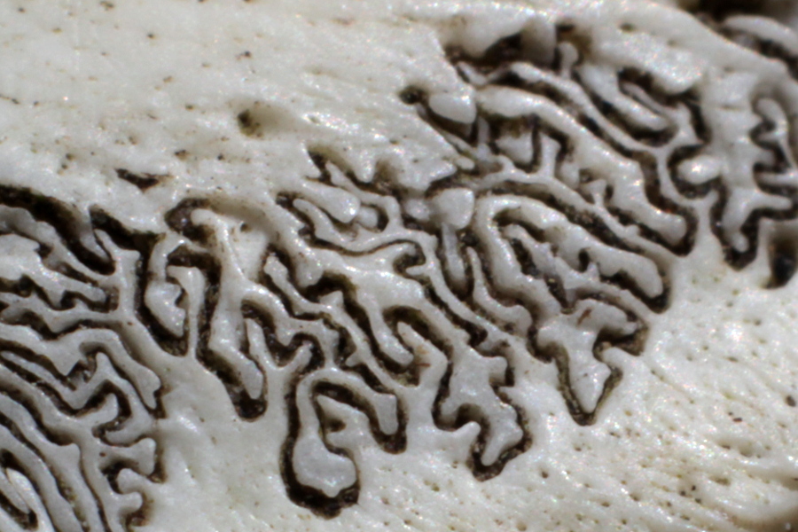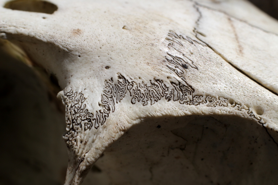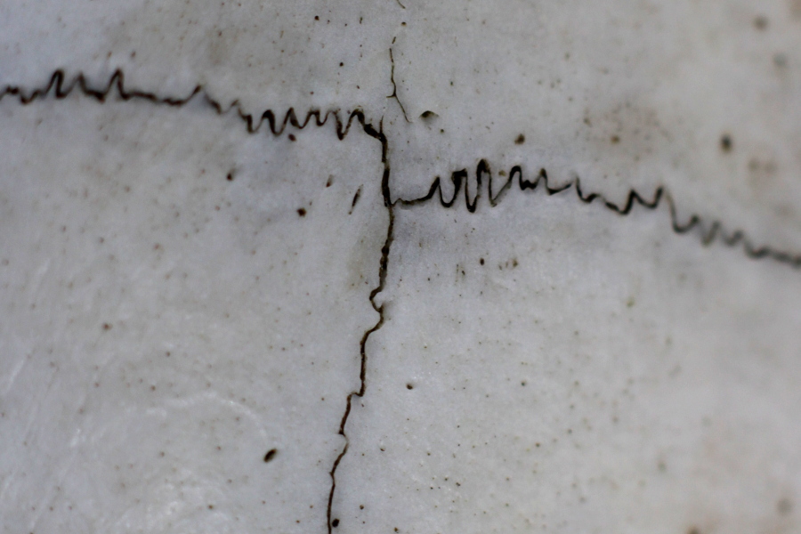 Ces jolies vagues noires correspondent à la suture entre deux os du crâne d’un mammifère. Les sinuosités répétées accroissent la résistance de cette articulation. Les sutures ne sont pas toujours aussi irrégulières, comme on peut le voir sur le dessus du crâne. Le deuxième indice correspondait à une incisive arquée, blanche et orange, d’un rongeur. Il s’agissait d’un crâne de ragondin !